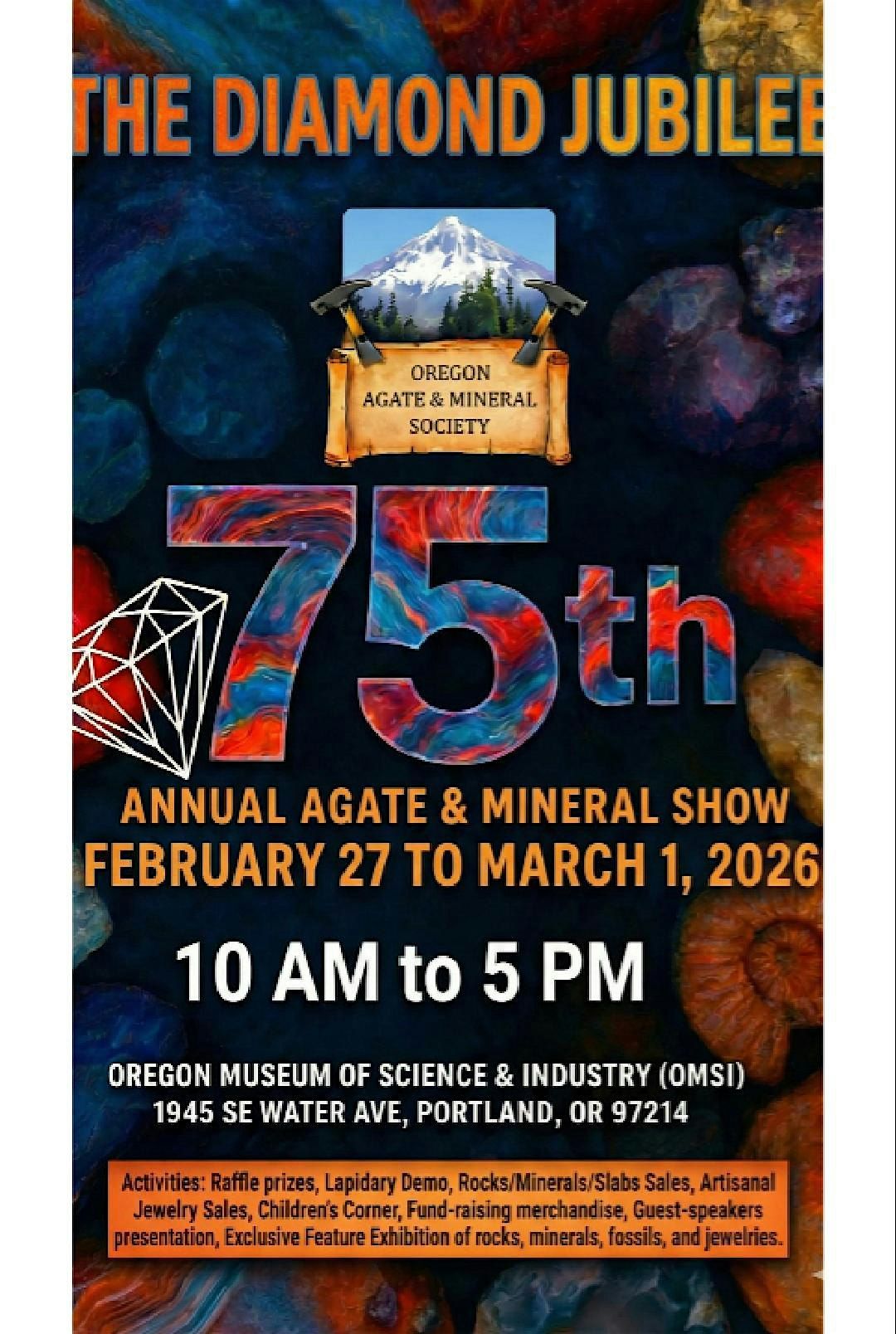 Welcome rock enthusiasts! Get ready for the 75th Agate and Mineral Show - The Diamond Jubilee at OMSI on February 27 to March 1, 2026 at 10:00 AM - 5:00 PM (Pacific Time). Join us for a day filled with dazzling displays of agates and minerals from around the world. Whether you're a seasoned collector or just starting out, there's something for everyone to enjoy. Don't miss this opportunity to marvel at nature's beauty up close!