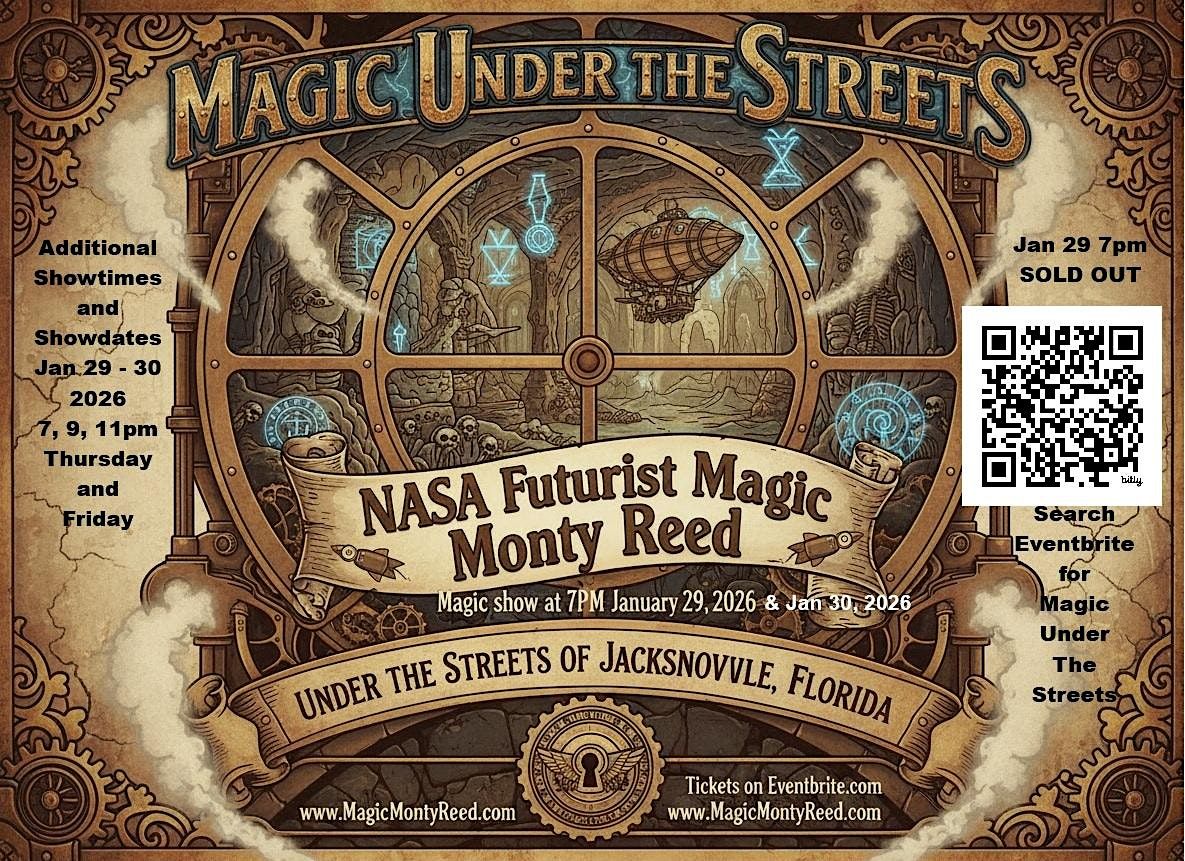 7pm Show Jan 30, 2026 Friday Come experience a night of wonder and amazement below Goozlepipe & Guttyworks under the streets of Jacksonville. Join us for a mystical journey into the underground catacombs of Jacksonville, where you'll witness mind-bending illusions and jaw-dropping Magic. Prepare to be amazed as our talented NASA Futurist Magic Monty Reed dazzles you with experiments into the super natural. Don't miss out on this unforgettable evening of Magic and mystery!