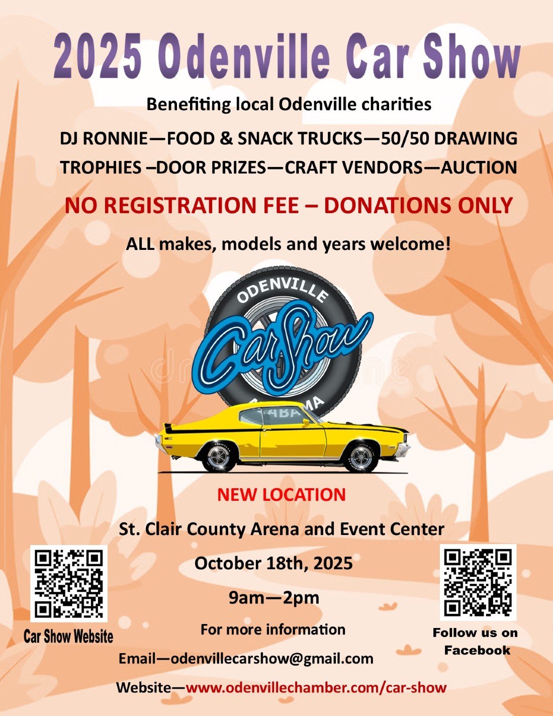 The Greater Odenville Chamber of Commerce hosts an annual charity car show. This year's event will be held on Saturday October 18 2025 from 9:00 am to 2:00 pm at the St. Clair County Area and Event Center. Proceeds will benefit Odenville Police Department other local Odenville charities. Event will include door prizes 50/50 raffle food trucks vehicle trophies and vendor booths. We will have DJ Ronnie Foster an auction and lots of beautiful cars trucks and motorcycles to admire!