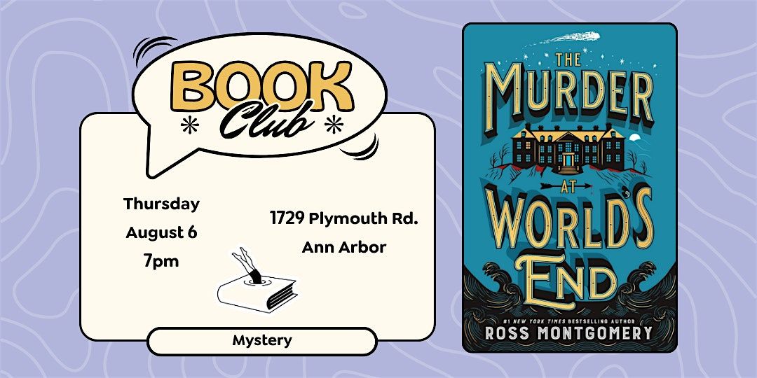 For our next mystery book club, we'll discuss The M**der at World's End by Ross Montgomery. We're meeting on Thursday August 6th from 7pm to 8pm.