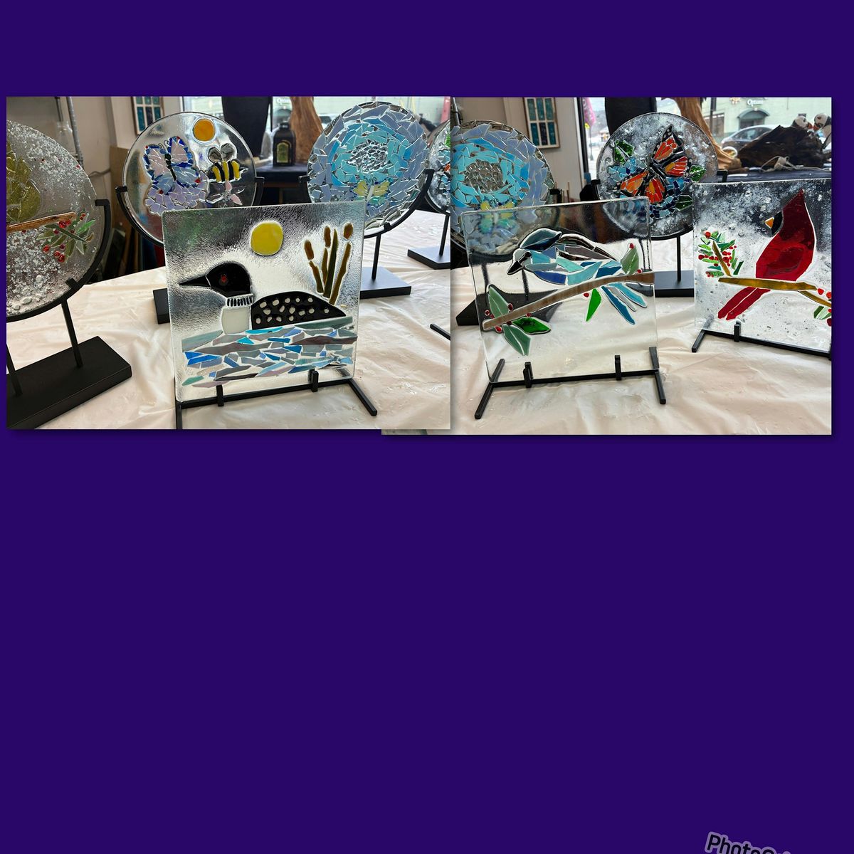 Create a glass art picture of your choice on an 8” square or round panel. All materials included plus wrought iron stand