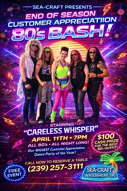 North Fort Myers...Join Careless Whisper at Sea-Craft Waterfront Tiki on Saturday, April 11th at 7PM for a night packed with nonstop hits, neon vibes, and throwback energy! 80s Costume Contest - $100 CASH PRIZE for BEST DRESSED! Sea-Craft Waterfront Tiki - North Ft. Myers, FL Show starts at 7PM