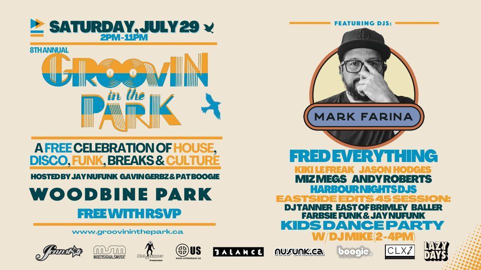 Saturday Day FREEE Groovin' in the Park Festival with House Music Legend Mark Farina - Mushroom Jazz Set.Limited capacity. RSVP required. https://GroovinInTheParkSaturdayRSVP.eventbrite.ca