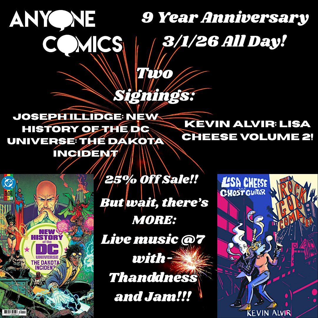9 years of business here in Crown Heights come celebrate with us, get New History of the DC Universe: The Dakota Incident signed by @illmasterone AND get your Lisa Cheese vol 2 coming out signed by the one and only @mr_kevinalvir !
