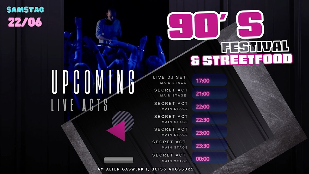 Willkommen beim ultimativen 90er Festival in Augsburg! Erlebe Nostalgie, Musik und Streetfood. Die besten 90er Live-Acts, Specials und DJ's