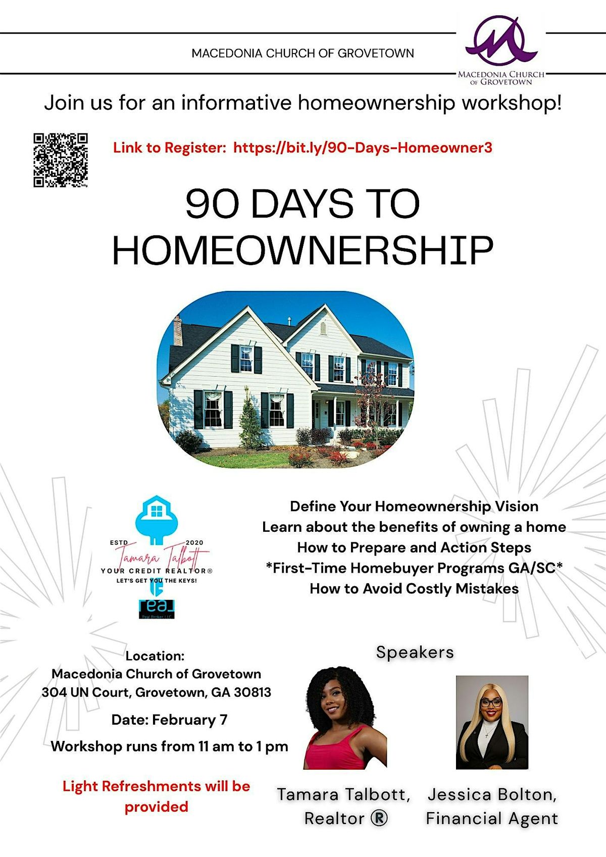 Join us at Macedonia Church of Grovetown for an informative session on how you can achieve homeownership in just 90 days! Whether you're a first-time buyer or looking to invest, our experts will guide you through the process step by step.