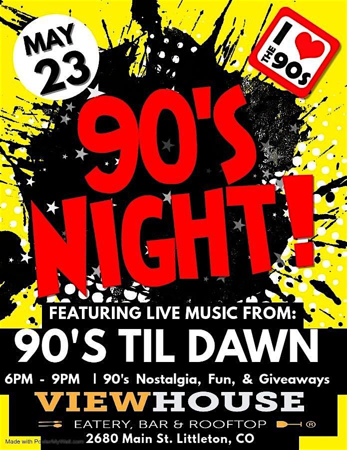 ViewHouse Littleton is throwing a 90’s bash! Come dressed in your best 90's outfit and rock the night away with 90s Til Dawn, Denver's Premier 90's cover band. Four hours of music, fun, prizes, and nostalgia await! Show starts at 6:00pm.