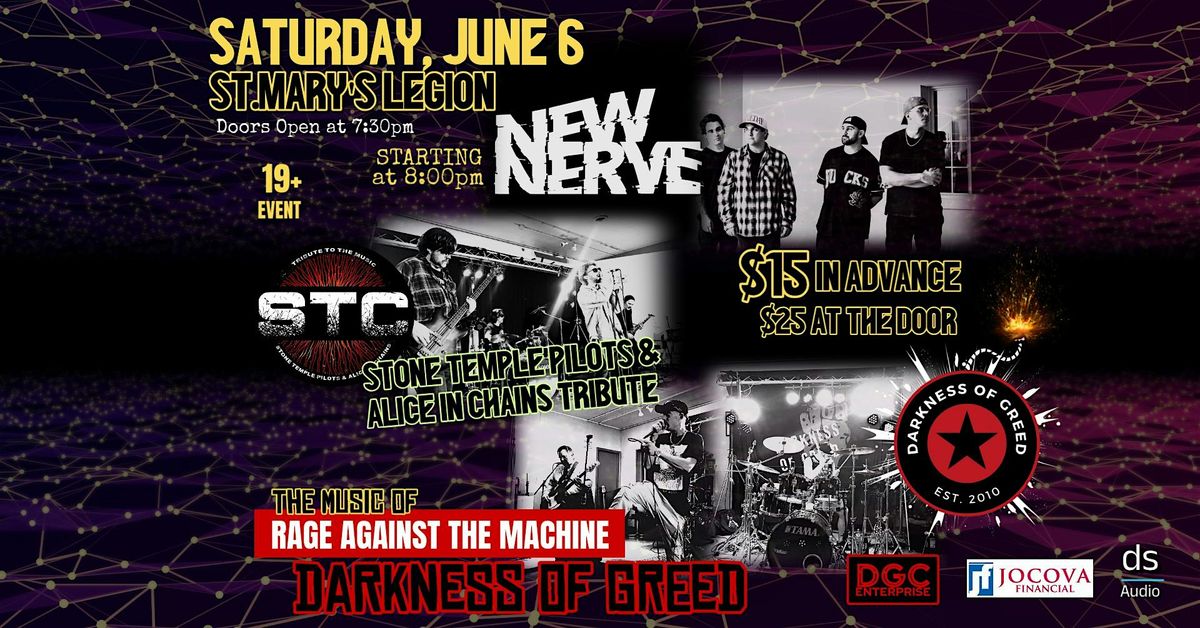 Headlining the night is Darkness of Greed, bringing the raw power and energy of Rage Against the Machine to the stage. Joining them is STC – Stone Temple Pilots & Alice In Chains Tribute, delivering the unforgettable sound of two of the biggest names in 90’s rock. Opening the night is New Nerve.