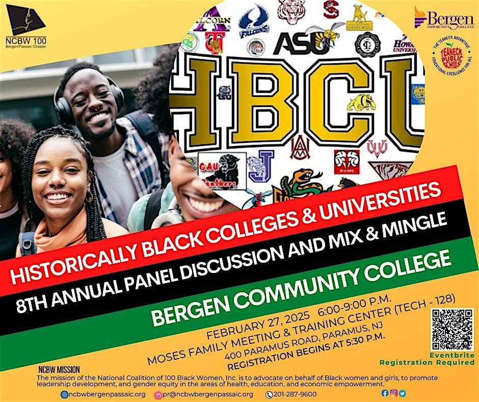 The National Coalition of 100 Black Women Inc, Bergen/Passaic Chapter, in partnership with Bergen Community College and Teaneck Public Schools, would like to invite All High School and Junior College Students, to learn about The Advantages Of Attending Historically Black Colleges And Universities.