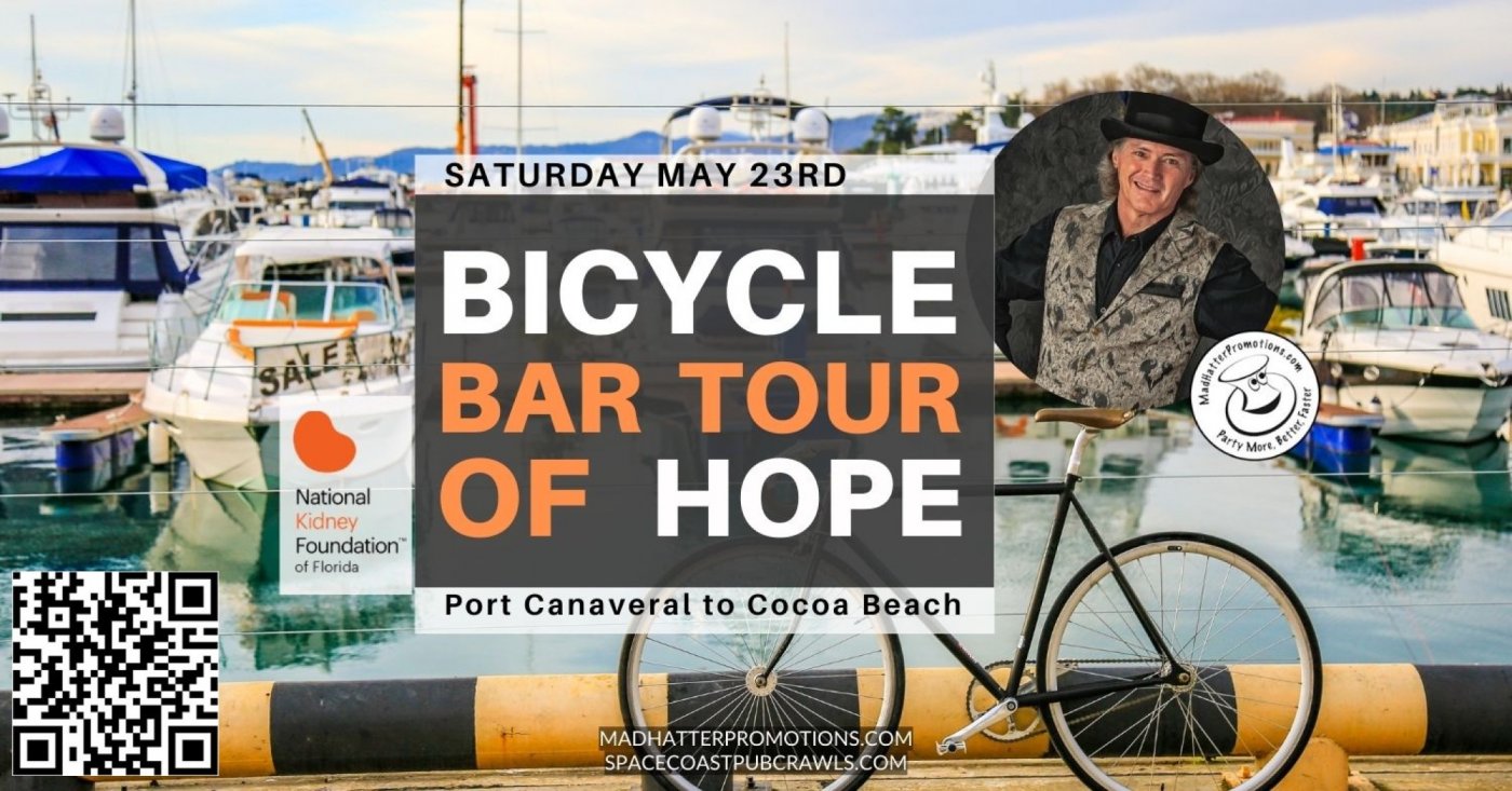 9th Annual NKF Bicycle Bar Tour of Hope, May 23, 11:00 am to 6:30 pm! Leisurely ride from Port Canaveral to Cocoa Beach & back. Supports the National Kidney Foundation of Florida. 50/50 drawing AND multiple door prize winners. Eight (8) Drinks – one at each stop! Tickets are $25 each in advance, or $35 day of. Starts at Fishlips Bar & Grill, 610 Glen Cheek Drive, Cape Canaveral, FL 32920. https://www.madhatterpromotions.com/2026-NKF-bicycle-bar-tour-of-hope.php