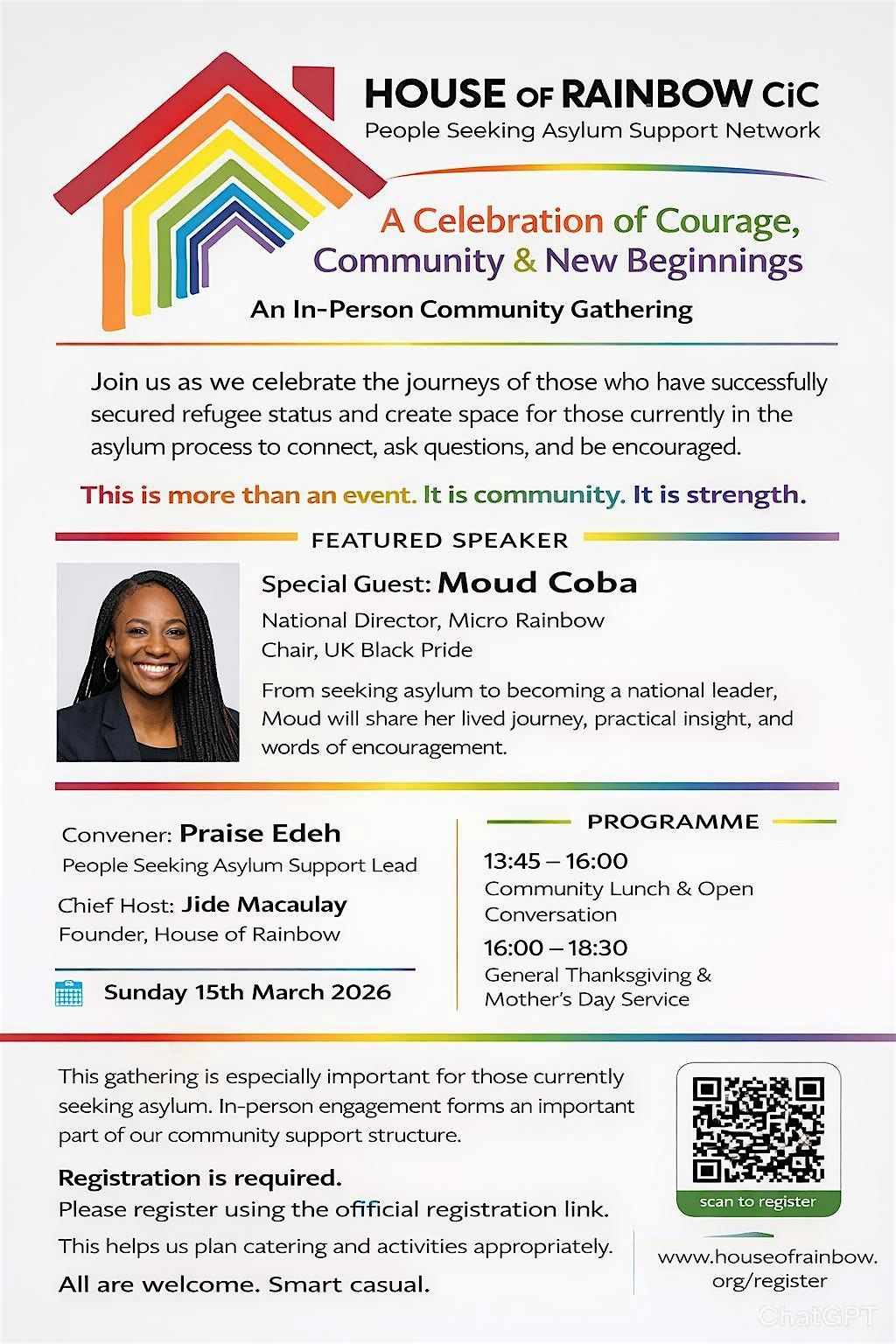 House of Rainbow CiC invites the community to an in person gathering celebrating courage, belonging, and new beginnings for people seeking asylum. The event honours those granted refugee status, offers guidance and encouragement, features Moud Coba, and includes shared meals, thanksgiving worship, and conversation. Registration is required. All are welcome. Smart casual dress. Sunday in London. Join hope and solidarity.