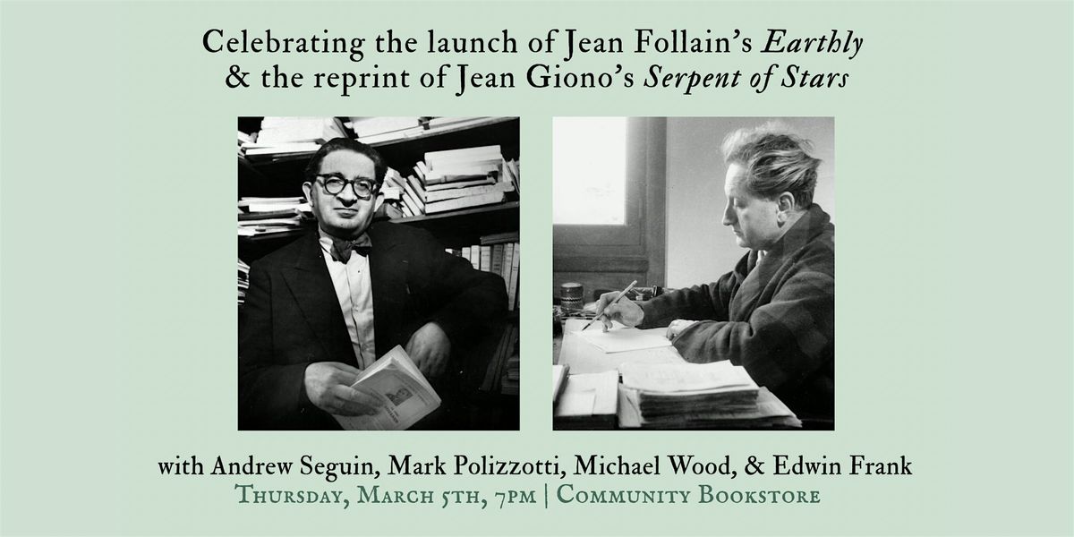 Join us for an evening of celebration and discussion of Jean Follain's Earthly and Jean Giono's Serpent of Stars. Andrew Seguin and Mark Polizzotti will read from the books, and will be joined in conversation by Edwin Frank and Michael Wood.
