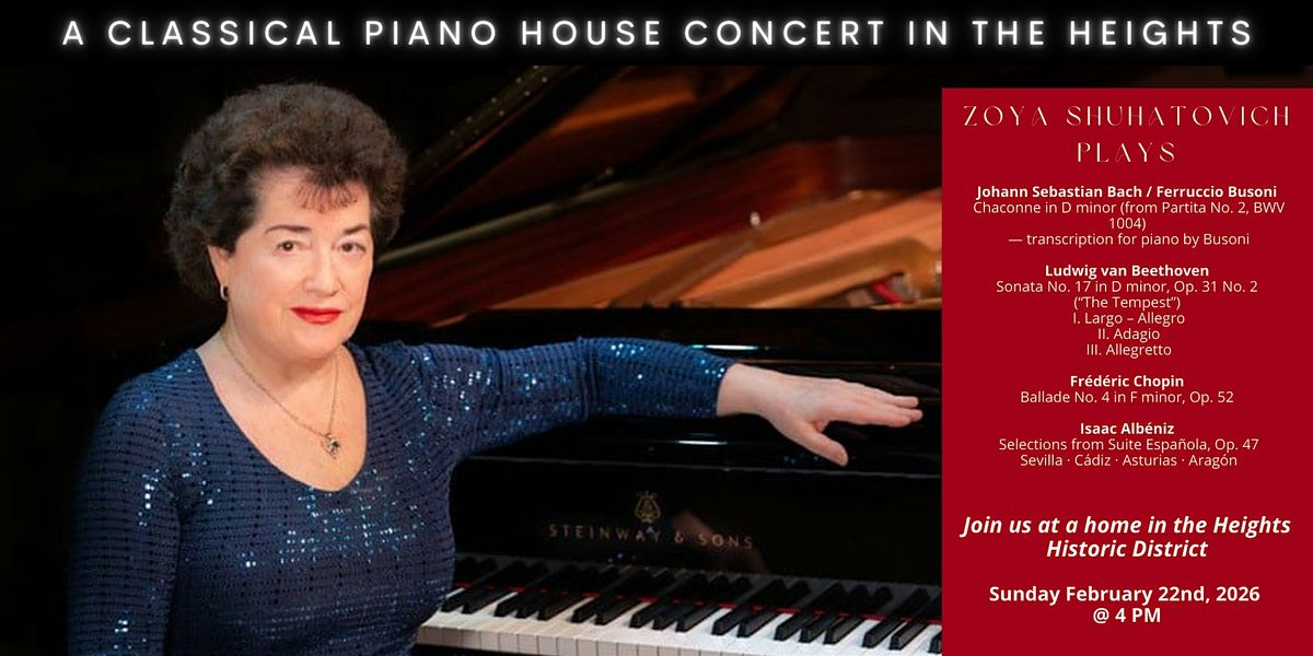 Experience classical piano the way it was meant to be heard: up close, personal, and fully immersive. This intimate house concert in the Heights features internationally acclaimed pianist Zoya Shuhatovich, performing a program that moves from the architectural depth of Bach to the drama of Beethoven, the poetry of Chopin, and the vibrant rhythms of Albéniz.
