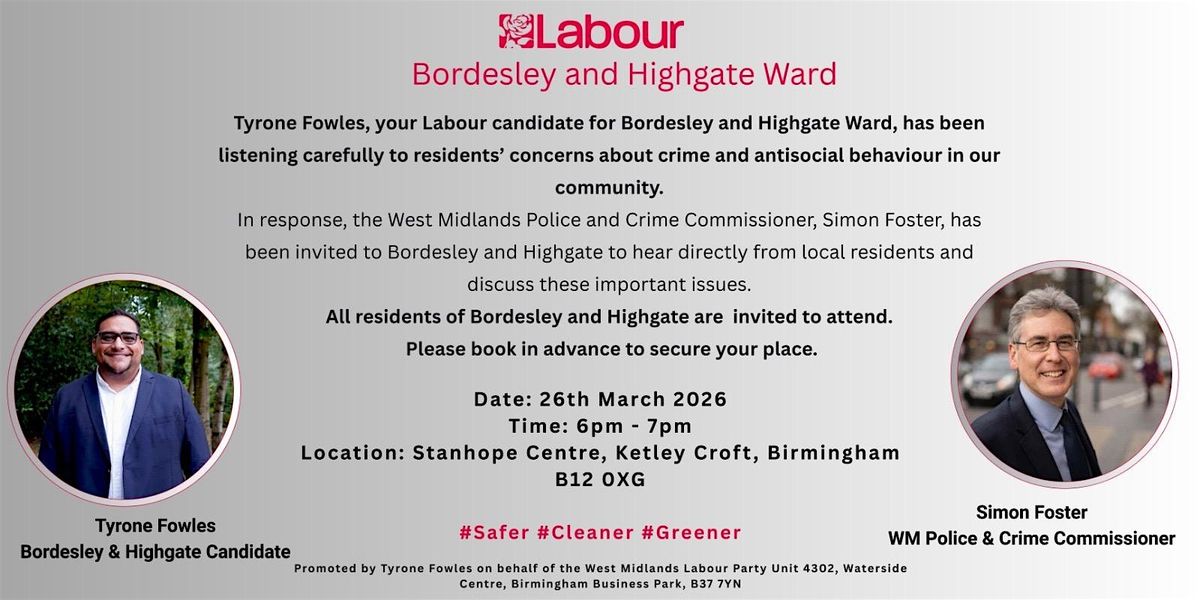 In response, the West Midlands Police and Crime Commissioner, Simon Foster, has been invited to Bordesley and Highgate to hear directly from local residents and discuss these important issues.
