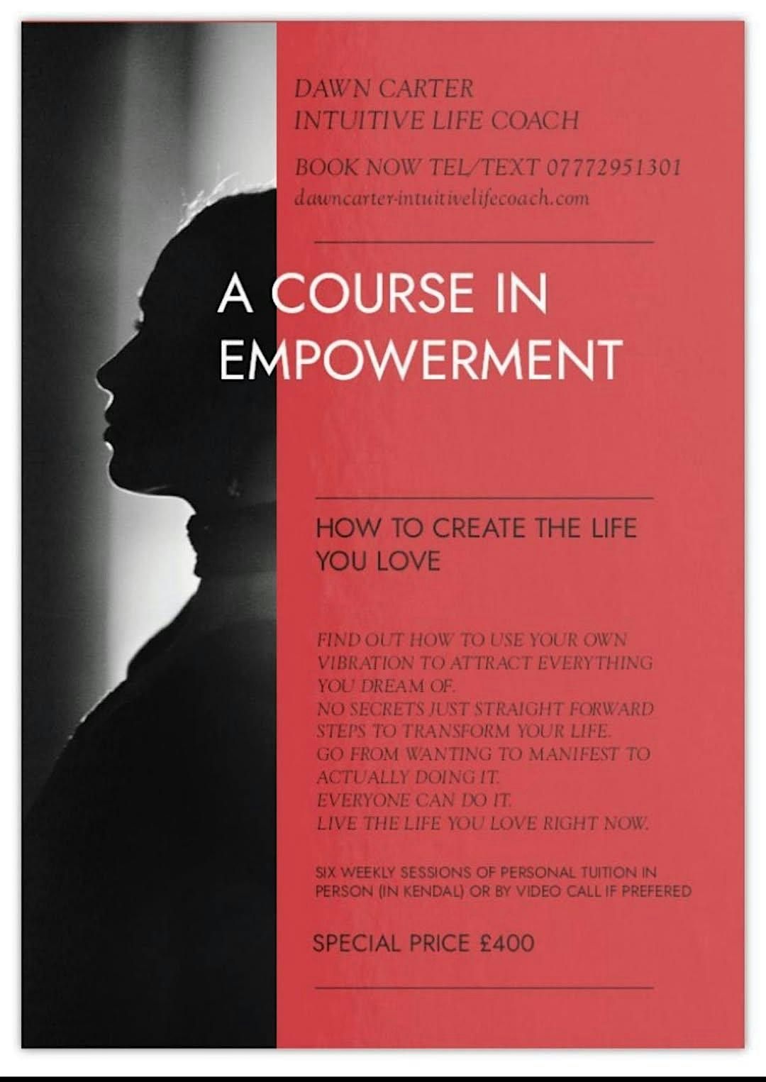I would love you to join me on Saturday 21st and Sunday 22nd March for a course in Empowerment , this is a transformative weekend journey to raise your vibration and attract abundance in all areas of your life!In just one special weekend you will discover the tools and techniques to manifest:More Money, Loving Relationships ,Exciting Career Opportunities, Your Dream Home, Healing, Family Connections, Supportive Friendships.