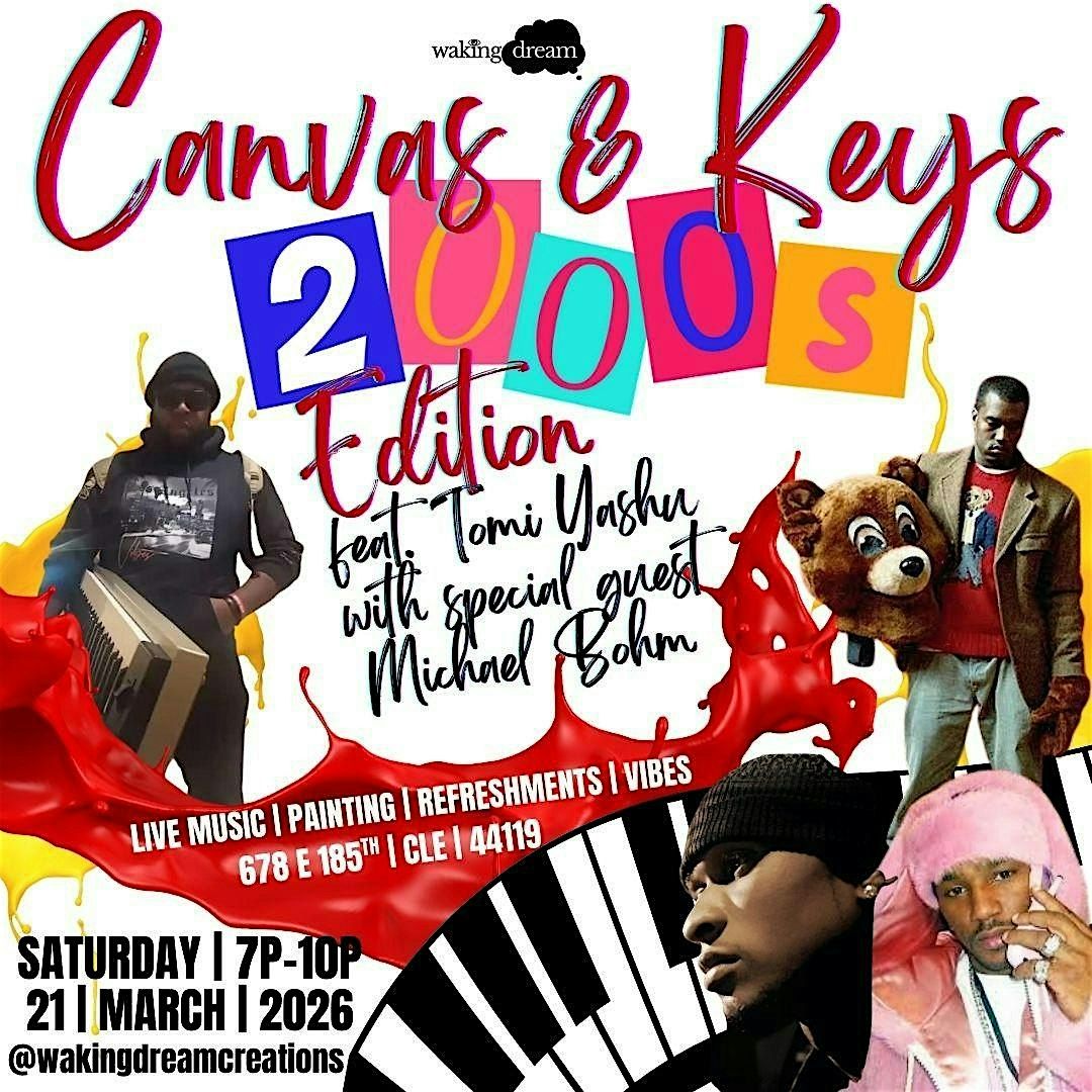 Canvas & Keys is an immersive paint & sip experience curated by Waking Dream Creations, featuring live piano performance by Tomi Yashu, setting the mood with smooth 2000's Hip Hop & R&B–inspired melodies. As the keys play, you’ll sip, relax, and bring your own nostalgic vision to life on canvas.
