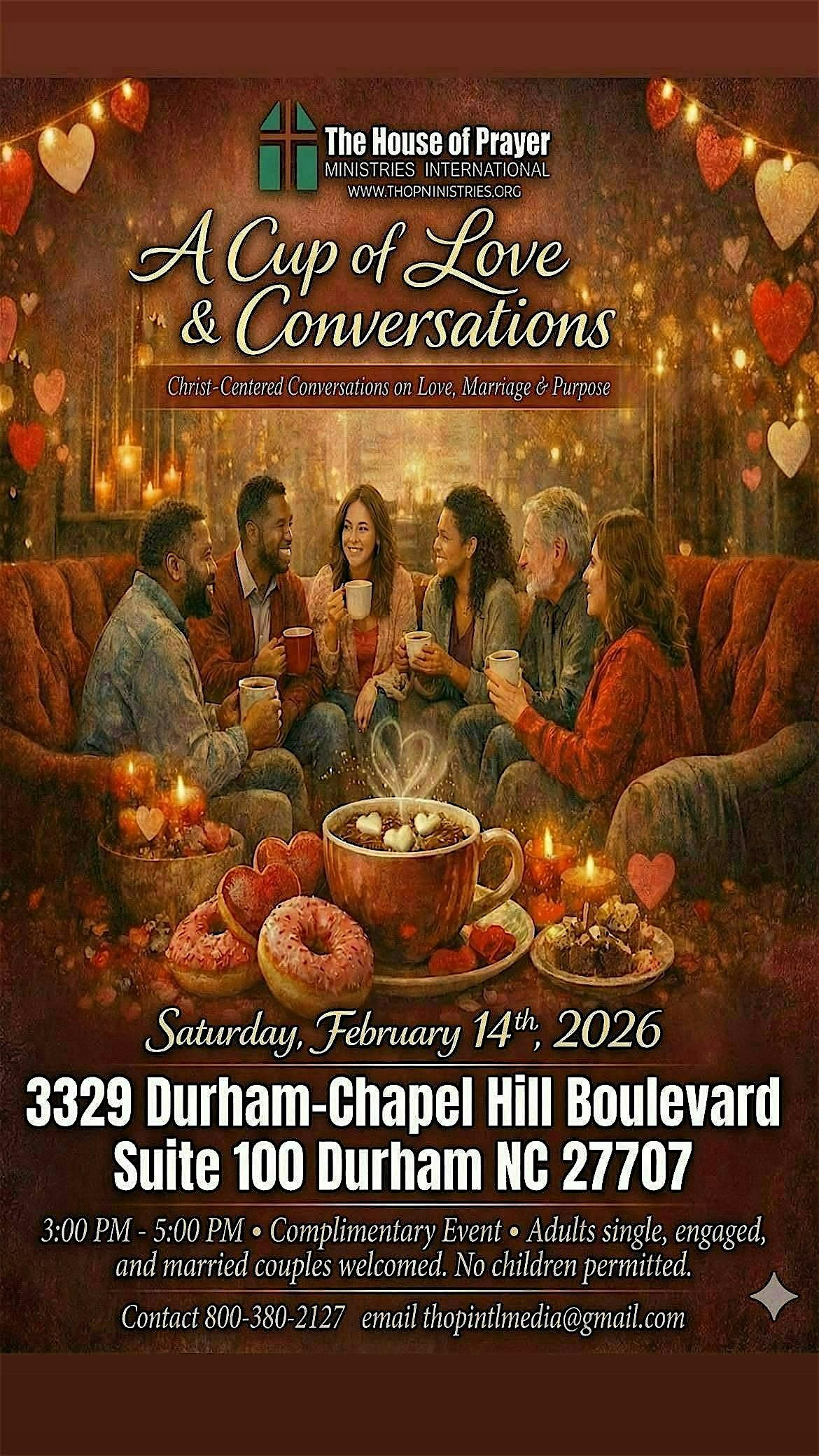 A Cup of Love & Conversations is designed to create an intimate, welcoming space where singles, married couples, and guests can encounter God’s heart for love, wholeness, relationships, and purpose.