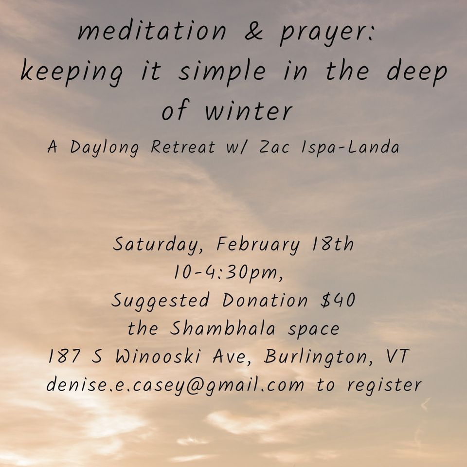 We're in winter friends. Deep winter. February in Vermont winter. Practice is already right here. Let's keep it simple and close on this day-long meditation retreat w/ teacher and friend Zac Ispa-Landa. Join us in this daylong retreat to practice meditation in community. We will practice sitting and walking meditation, visualizations, lovingkindness, prayer, and movement. We will also explore what this emerging practice community might look like as it grows . The foundation of our practice will be to cultivate clarity, stability, and spaciousness so we can see more deeply into the nature of our heart-mind. We’ll practice connecting to the loving and compassionate nature of the heart with Homecoming practices supported by our guides and sources of refuge.