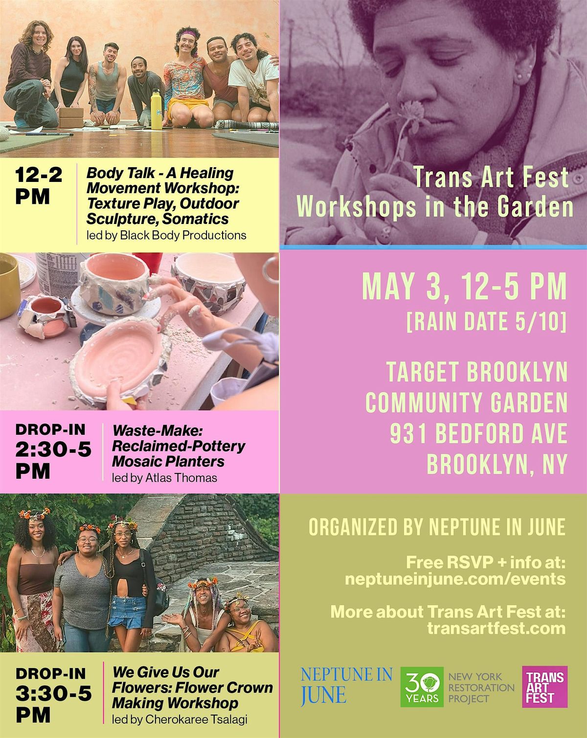 Join Neptune in June for a day of workshops in the garden for Trans Art Fest! Featuring Body Talk: A Healing Movement Workshop led by ?Black Body Productions, Waste-Make: a reclaimed-pottery ?mosaic workshop led by Atlas Thomas, and We Give Us Our ?Flowers flower crown-making led by Cherokaree Tsalagi.
