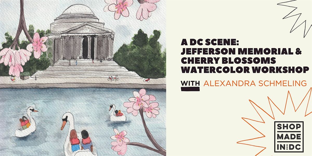 Celebrate cherry blossom season in the DMV with a guided 2-hour watercolor class. Guests will be provided with a pre-drawn image of the Jefferson Memorial with cherry blossoms and swan boats.