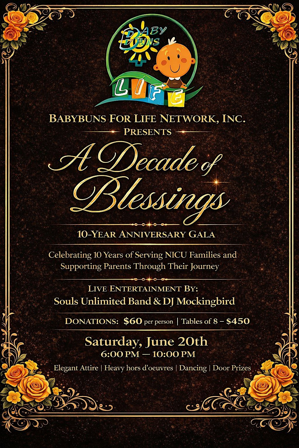 Support Babybuns For Life at our Decade of Blessings Gala an elegant evening of celebration, music, and giving back.