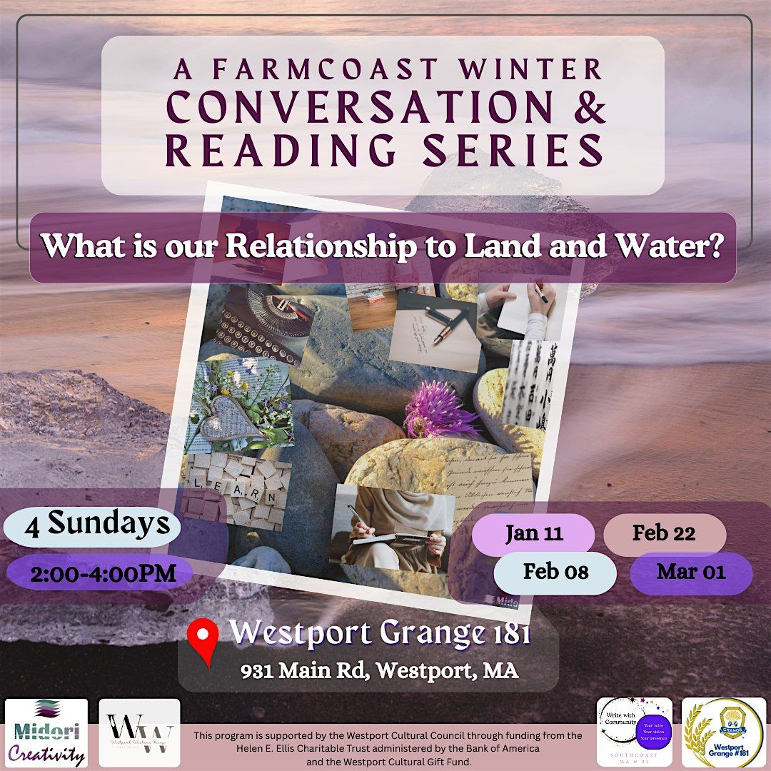 A Farmcoast Winter Conversation and Reading Series is a four-part series of two-hour gatherings, each with its own mix of reading, conversation, and writing, focused on our relationship to land and water. Designed to appeal to a wide community audience, the series integrates local viewpoints, writers from around the area, and a variety of facilitators including environmental stewards, land & water farmers, and writers.