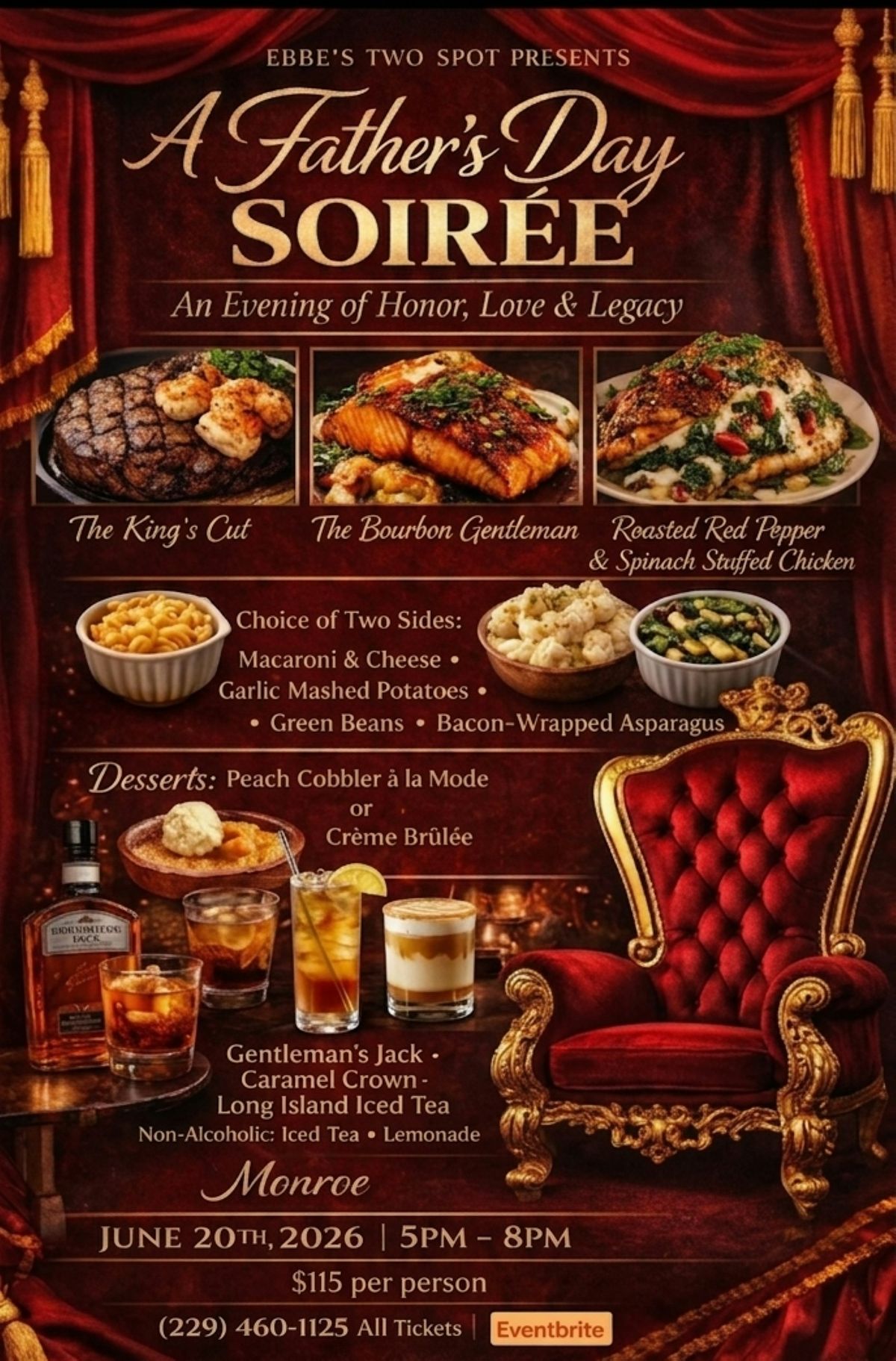 Join Ebbe's Two Spot, LLC as we honor the fathers and father-figures in our lives. An upscale and elegant dinner service, a moment to share your heart and thoughts about your father and the impact they have made in your life. Enjoy a refinded select menu and beverages, partake in a rousing game of dominos or cards, music and light dancing, and photo opportunities, all within an atmosphere that makes the man in your life feel like the King they are.