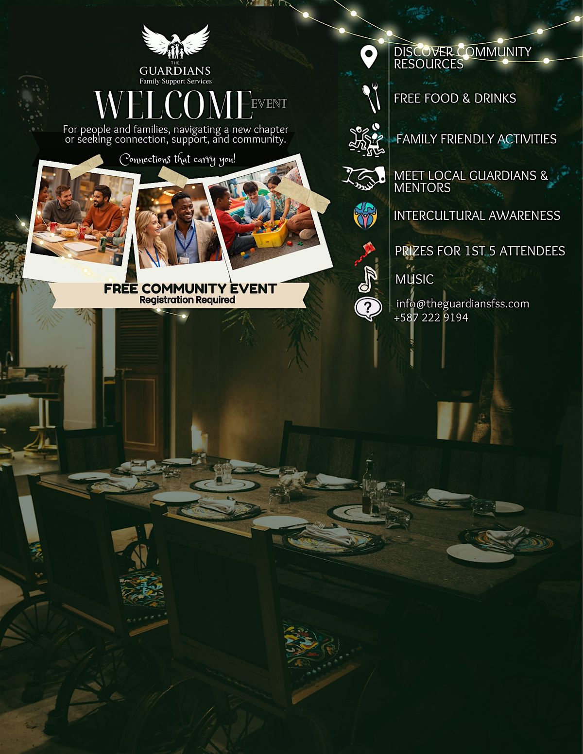 A FREE community "WELCOME EVENT" gathering SATURDAY MARCH 28 The Guardians Family Support Services.