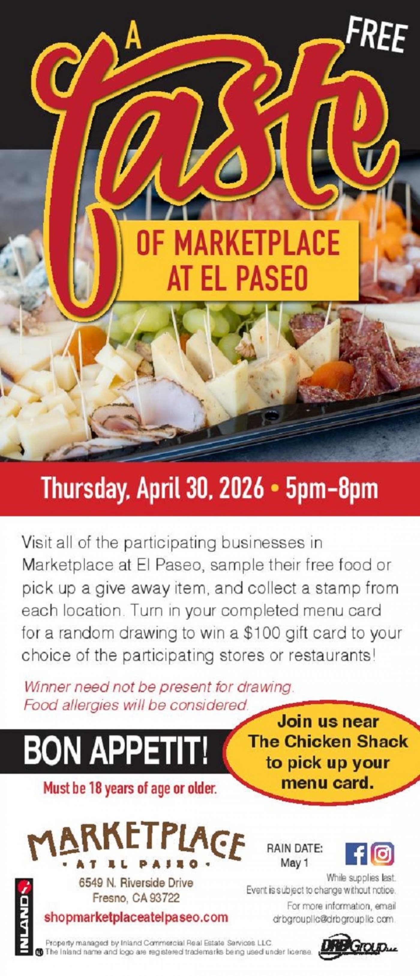 Join us and see what the Marketplace at El Paseo has to offer! Pick up your menu card near The Chicken Shack and sample free food and beverages, or pick up a give away item, from participating businesses in the center. Receive a stamp from each participating location to complete your menu card. Turn in your completed menu card for a chance to win a $100 gift card to your choice of the participating stores or restaurants!*