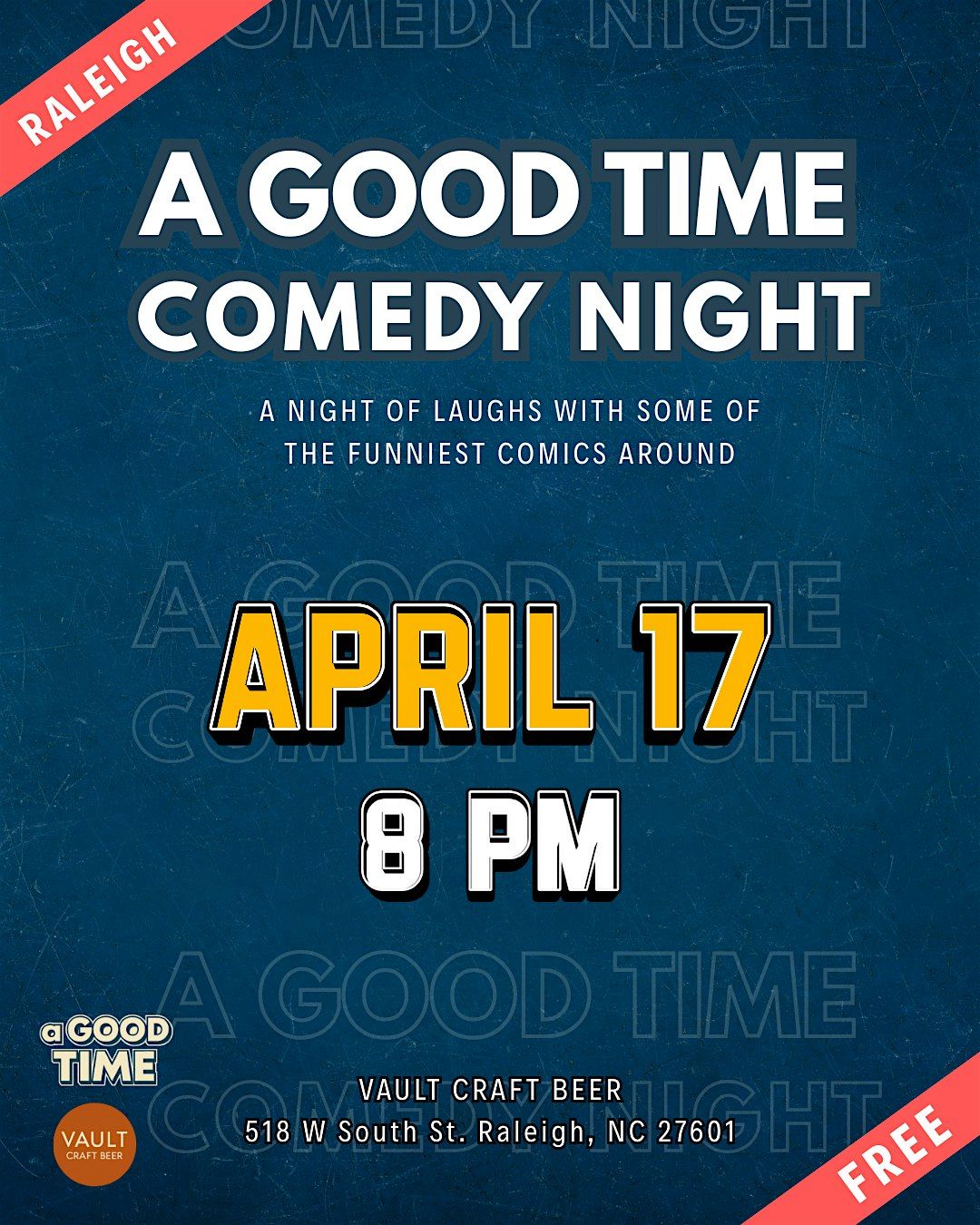 Food note: Vault sometimes has food trucks, and you can also bring your own food or order delivery. Follow @vaultcraftbeer and @agoodtimecomedy for updates.