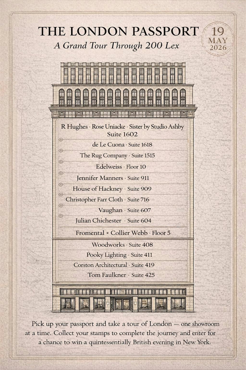 Collect your stamps (AKA business cards) from each showroom to complete the journey and enter for a chance to win a dinner for two in the West Village at a quintessentially British restaurant, KING