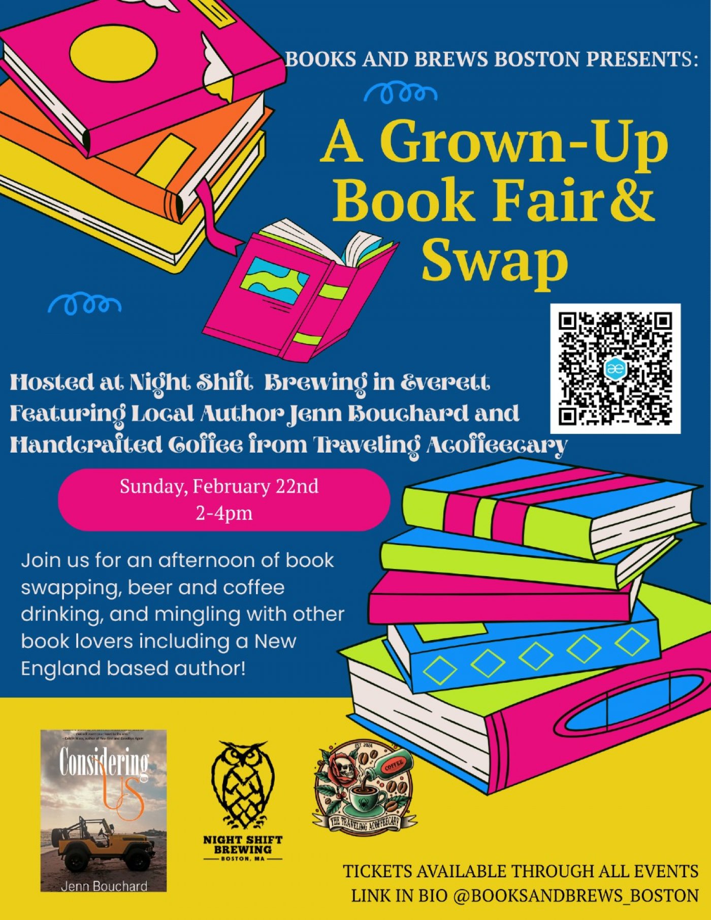Hi Bookies! We've got a fun, new place to swap...Night Shift Brewing in Everett! It may be cold outside, but we will be warm inside with beers and handcrafted coffee from Traveling Acoffeecary. For those of you who are new to Books and Brews Boston events, just bring a gently used book (or books) to swap. We are sure you will go home with some exciting "new to you" titles! Local author Jenn Bouchard will be there to add to the fun! Jenn will have copies of her New England- Based books Considering Us and First Course for purchase. Can't wait to see you there!