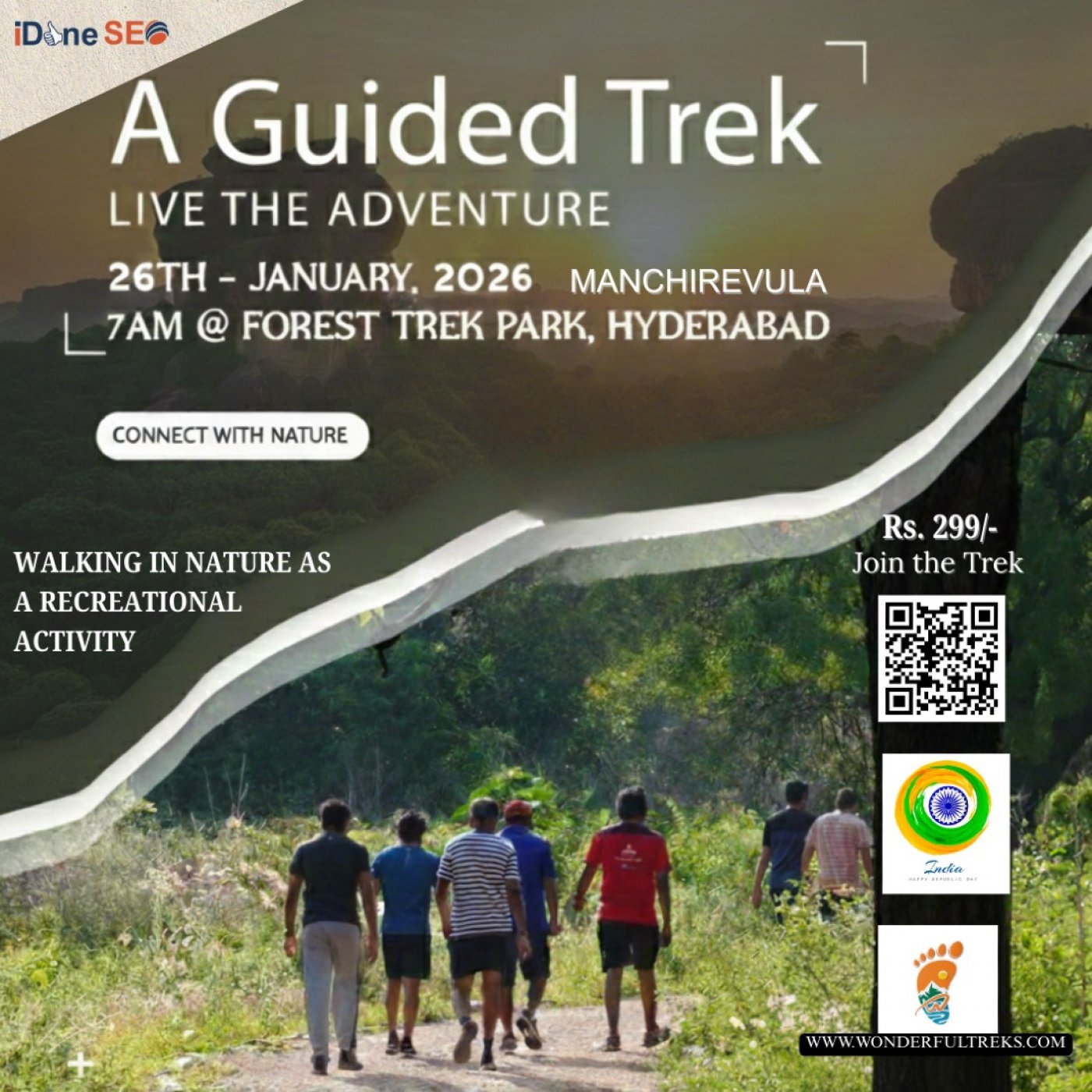 On Republic Day, Monday, January 26th (7:00 AM – 11:00 AM), the experience begins with a warm welcome, participant check-in, and a brief safety orientation followed by light warm-up stretches. The guided trek then takes participants through Manchirevula’s forest trails, ancient boulders, and scenic viewpoints, offering a refreshing blend of adventure, fitness, and tranquility in Hyderabad’s greenest lung space.