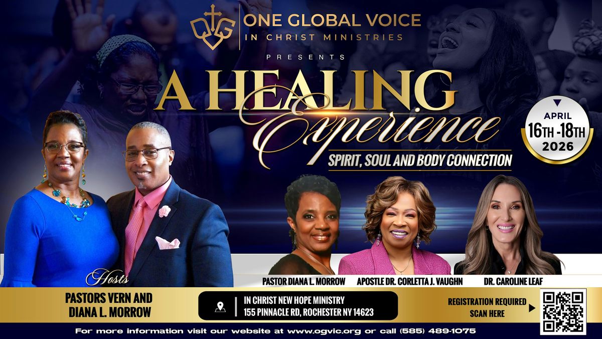 Join us for A Healing Experience: Spirit, Soul & Body Connection, a transformative three-day conference designed to renew your mind, invigorate your spirit, and restore your body. Set against the welcoming sanctuary of In Christ New Hope Ministry in Rochester, New York, this gathering brings together distinguished speakers, enriching workshops, and moments of soulful reflection—all in an atmosphere of grace, elegance, and heartfelt community.