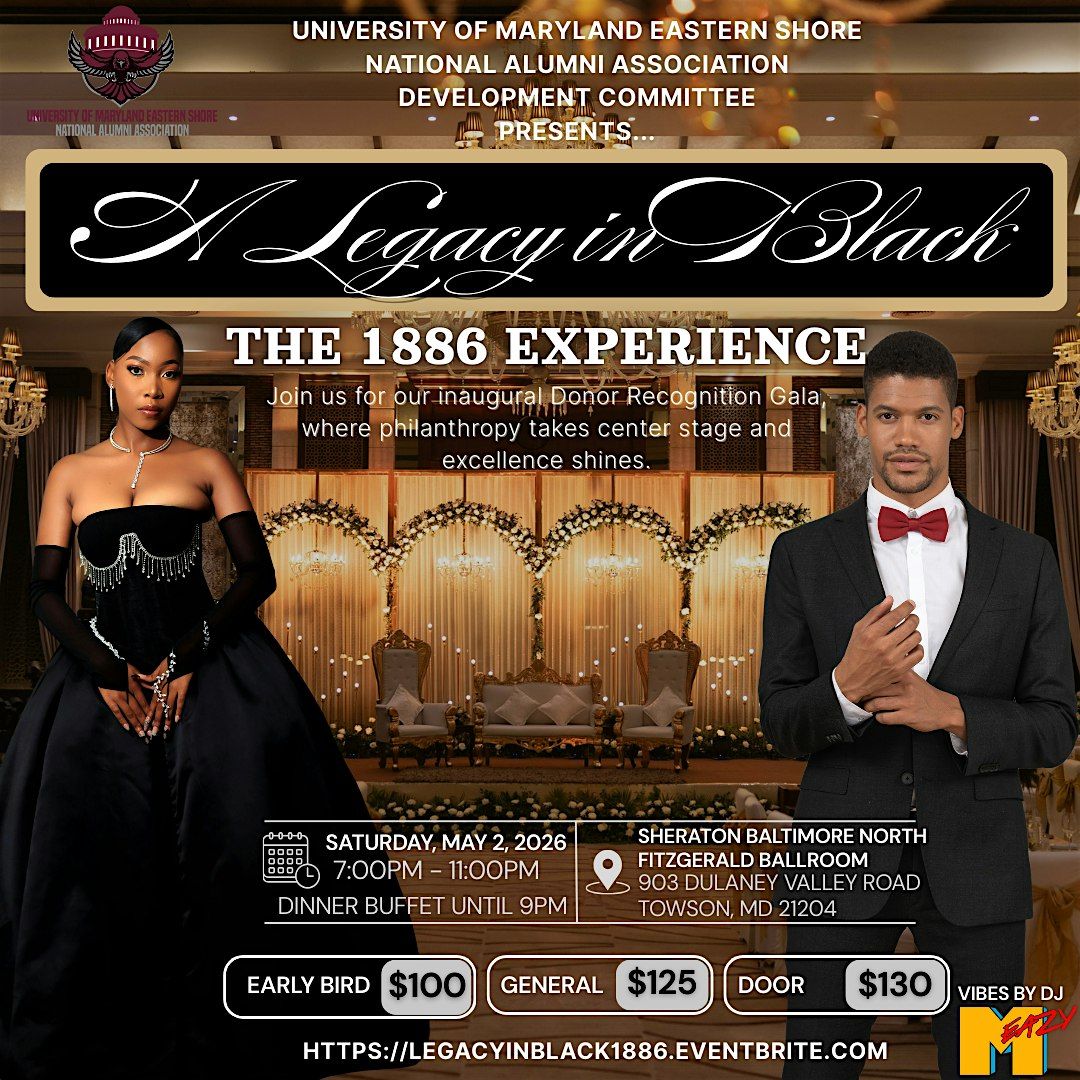 Welcome to A Legacy in Black: The 1886 Experience! Join us at the Sheraton Baltimore North Hotel on May 2, 2026 at 7:00 PM as we celebrate the generosity of our donors and their legacy of excellence firsthand. Don't miss out on this unique experience with vibes by Alumnus, DJ M-EAZY! See you there!