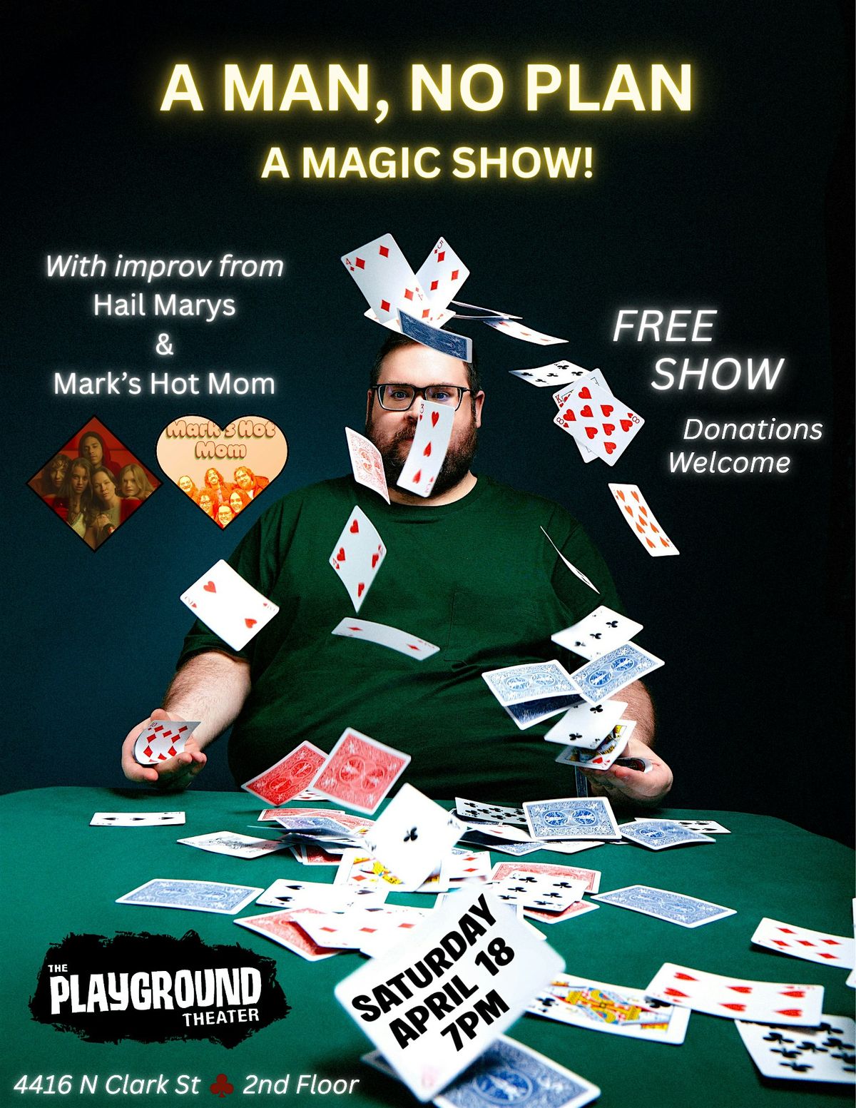 In the true spirit of Chicago style improv, “A Man, No Plan, A Magic Show”, is a fully improvised and unscripted close up magic show with playing cards brought to you by trained improviser and magician, Dan Feltey. Don’t miss your chance to see this once in a lifetime magic show, no two shows will ever be the same.