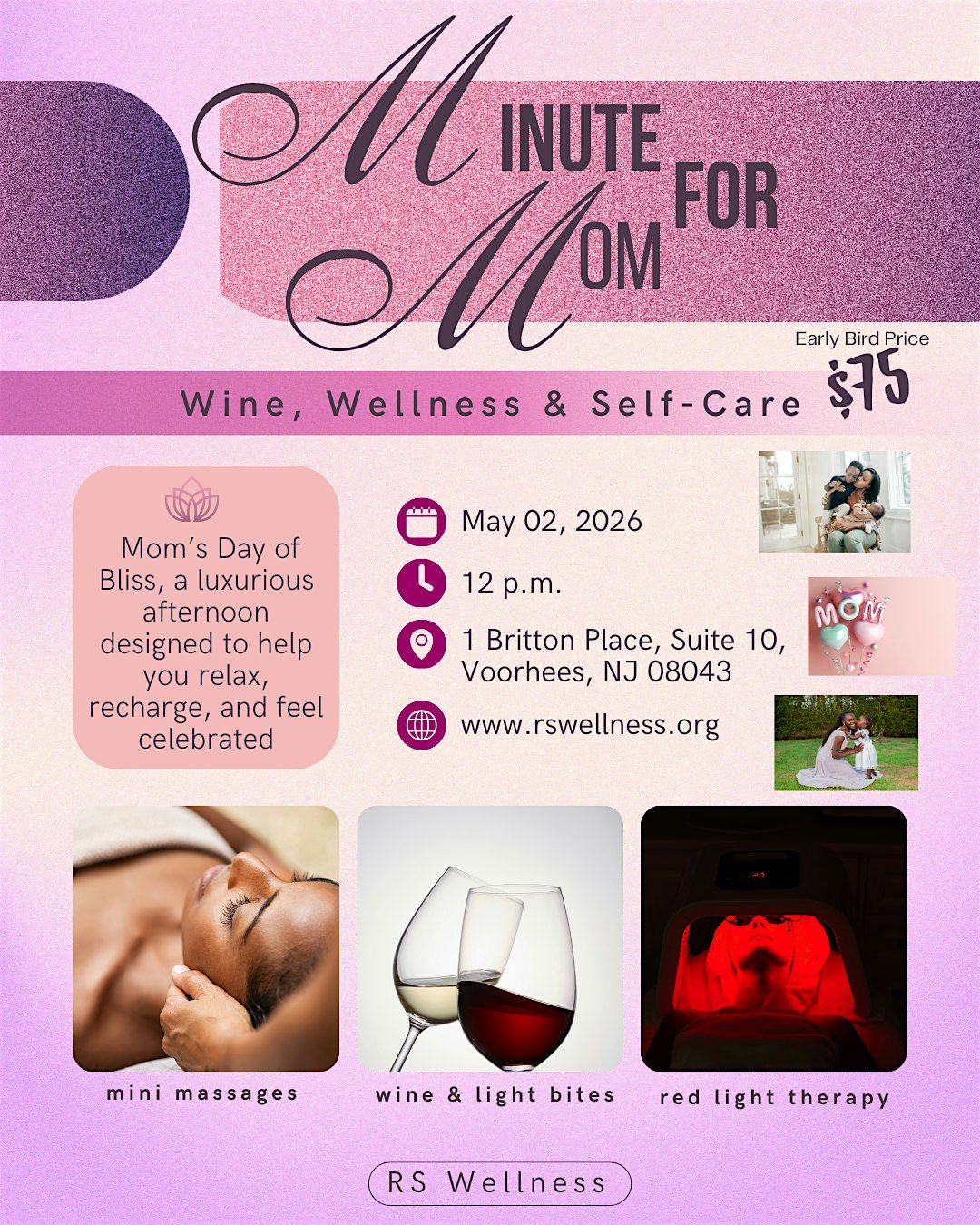 A Minute for Mom: Celebrate the amazing women you are this Mother’s Day with Mom’s Day of Bliss, a luxurious afternoon designed to help you relax, recharge, and feel celebrated. Indulge in wine, light bites, mini massages, and red light therapy sessions, all while connecting with like-minded moms in a calm, uplifting environment.