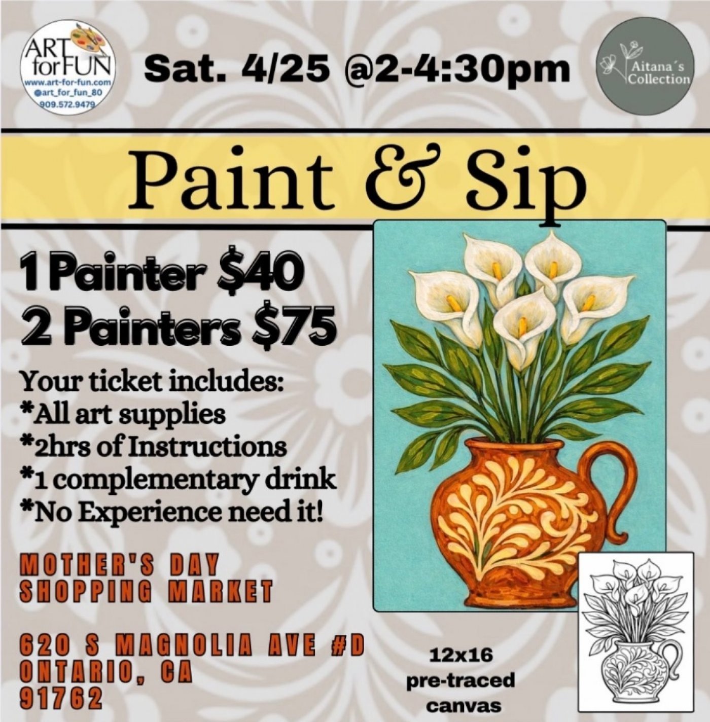 💕 Join us for a Mother’s Day Paint & Sip at Aitana’s Collection and enjoy a fun, relaxing painting experience perfect for celebrating Mom. 🗓 April 25 ⏰ 1:300 PM – 4:00 PM 📍 Aitana’s Collection 620 S. Magnolia Ave #D. Ontario CA.