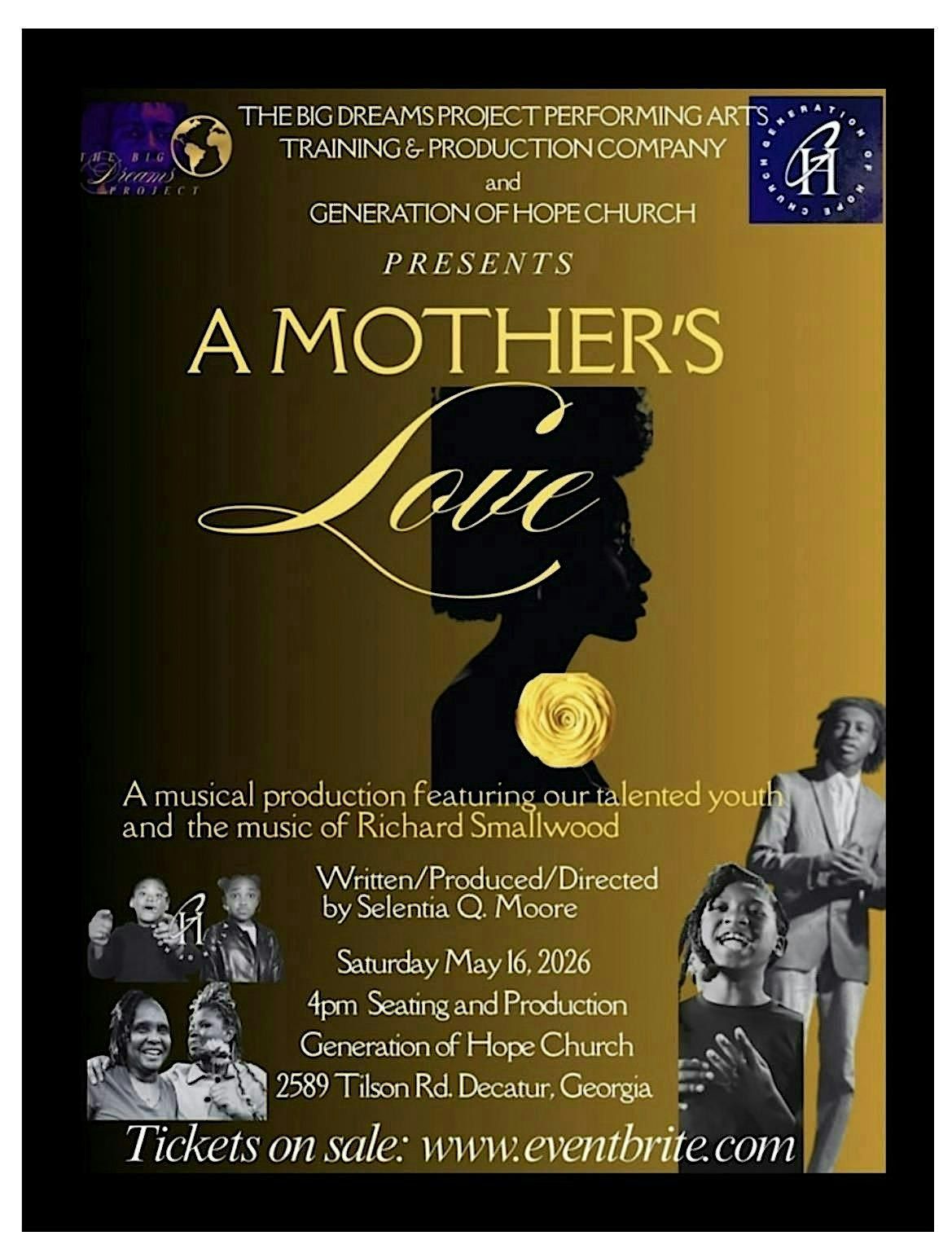 Featuring the gifted and talented youth of The Big Dreams Project Performing Arts and Generation of Hope Church! This production is a tribute to faith, culture, and the enduring journey of A MOTHER'S LOVE!