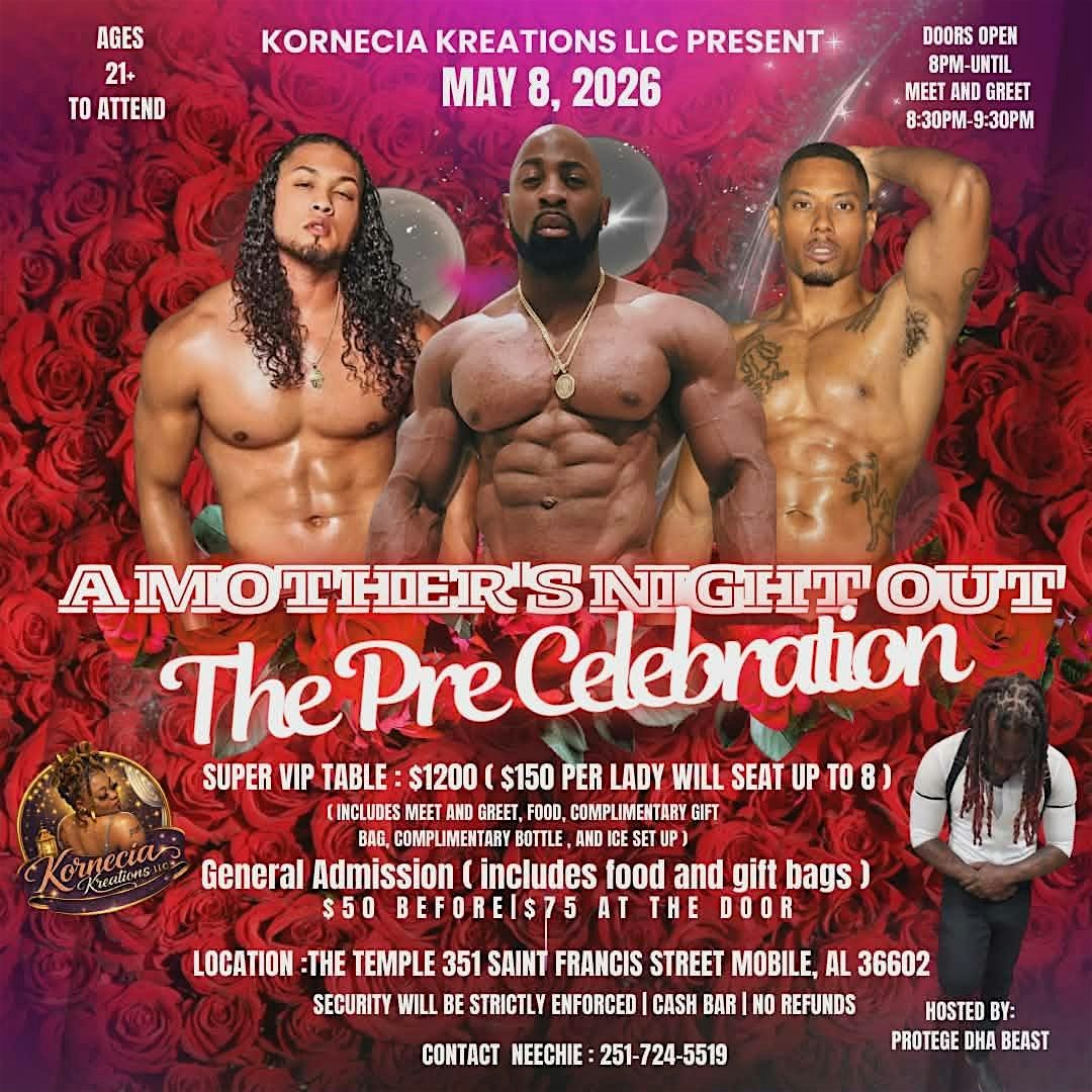Ladies on our eventbrite link you will be able to only purchase $50 general admission only. The day of the show tickets will be $75! No refunds unless we are at fault. The tickets will include food and a small gift! We are celebrating all ladies! Entertainment include Midnight, Big D and Baby Face! there will also be a special surprise so beat us there! So much sexiness in Mobile, Alabama May 8th! Doors will open at 8pm sharp.