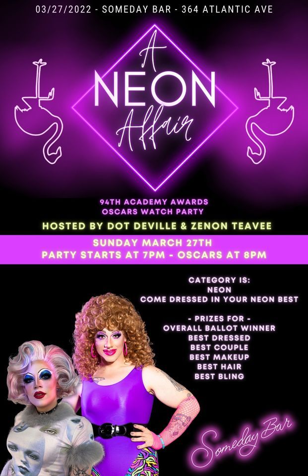 Come watch the 94th Academy Awards Oscar party at Someday Bar. Hosted by Zenon Teevee & Dot Deville. Party starts at 7pm and the Oscars start at 8pm. Come dressed in you nicest fancy neon apparel. Prizes for: