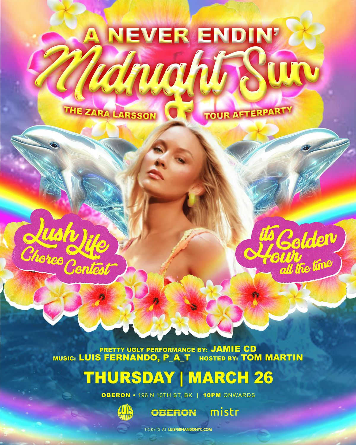 Keep the sunshine alive all night at the ultimate golden-hour afterparty. Expect bright, beachy vibes, tropical florals, rainbow lights, and nonstop dance beats. DJ sets by Luis Fernando and P_A_T, a special Pretty Ugly performance by Jamie CD, and host Tom Martin keep the floor moving. Enter the Lush Life Choreo Contest for a chance to shine.