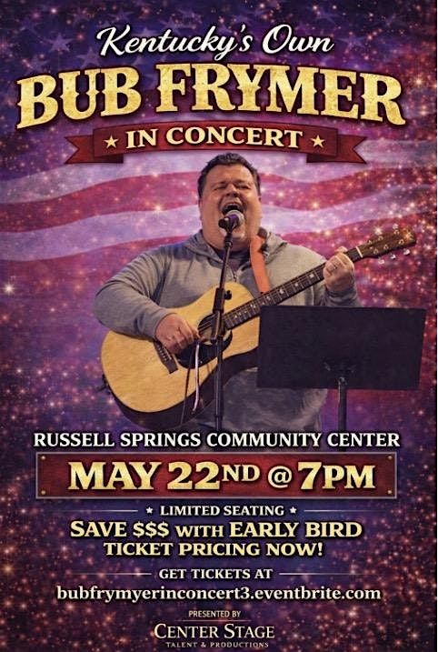 Get ready for a powerful night of music, heart, and hometown energy as Bub Frymyer takes the stage at the Russell Springs Community Center!