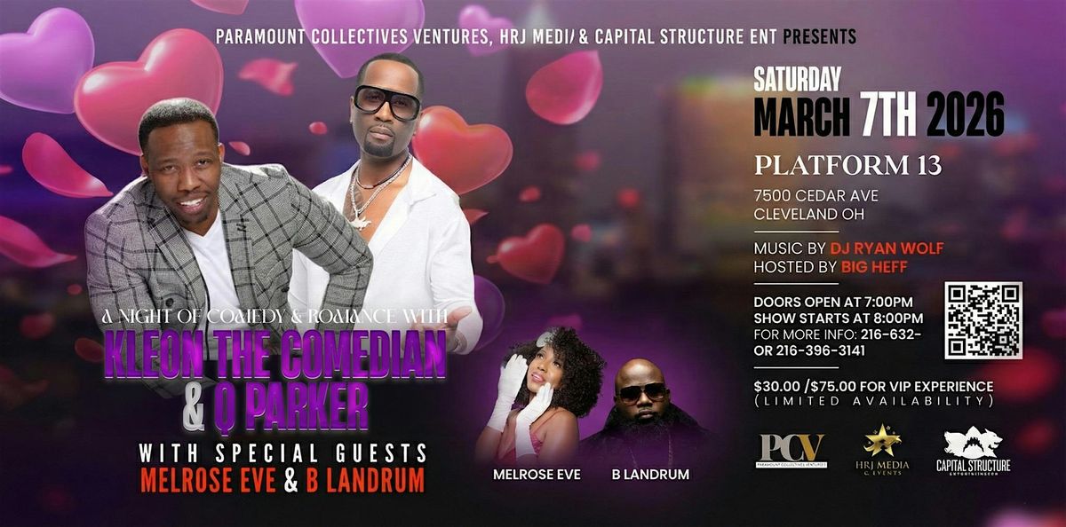CLEVELAND GET READY! R&B Legend Q Parker and internet sensation Kleon The Comedian have joined forces for a night of Laughter and Romance. Get ready to laugh at the hilarious standup comedy of Kleon The Comedian who has become one of social media’s premier comedians. Also, enjoy the smooth romantic sounds of Grammy-winning R&B singer, songwriter, and producer, Q Parker. Q will perform songs from his new release entitled “Evolution of Romance, Volume One,” as well as some of the classics from his days with the Legendary group 112 that he was a founding member of. The night will get started with Cleveland's hometown talents of B Landrum and Melrose Eve. This event goes down at the sexy venue Platform 13. GET YOUR TICKETS TODAY!
