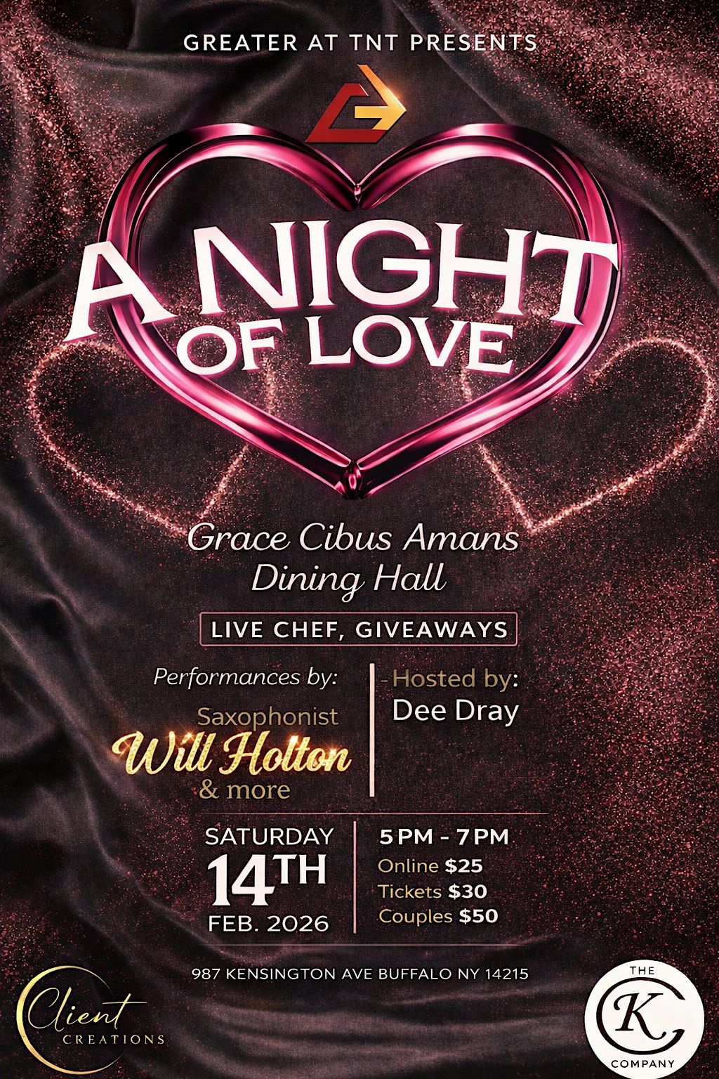 Get ready for an unforgettable evening filled with good vibes and great company! Join us in person for A Night of Love, where warmth, laughter, and connection take center stage. Whether you're celebrating with friends or someone special, this night promises magical moments you won't want to miss. Come as you are and let the love flow!