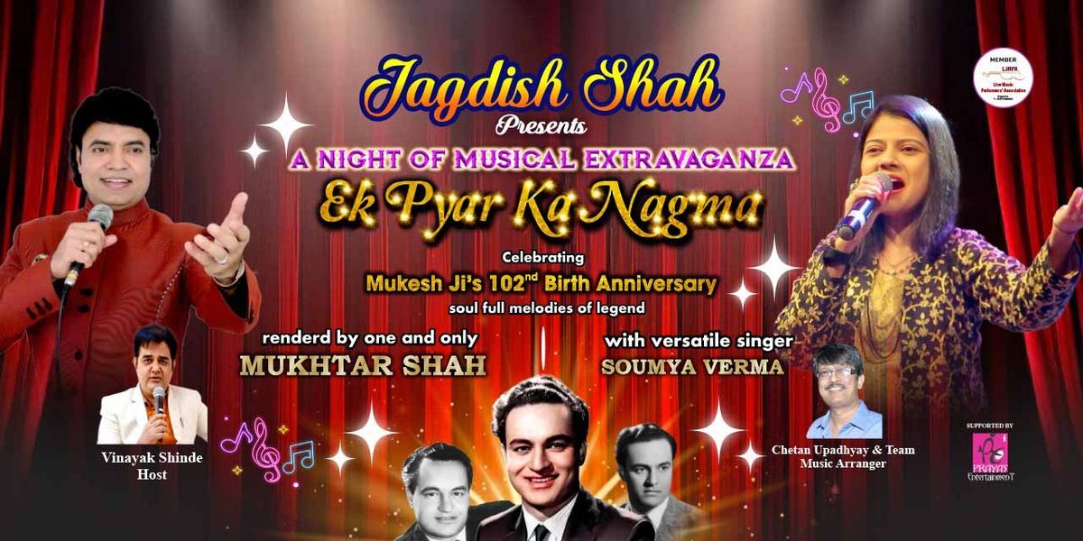 “Ek Pyaar Ka Nagma Hai” Celebrating Mukeshji’s 102nd birth Anniversary with his timeless and soulful melodies of evergreen Hindi Cinema rendered by one and only “Mukhtar Shah” with versatile singer Saumya Verma along with an orchestra of 10 musicians arranged by Chetan Upadhyay and team.