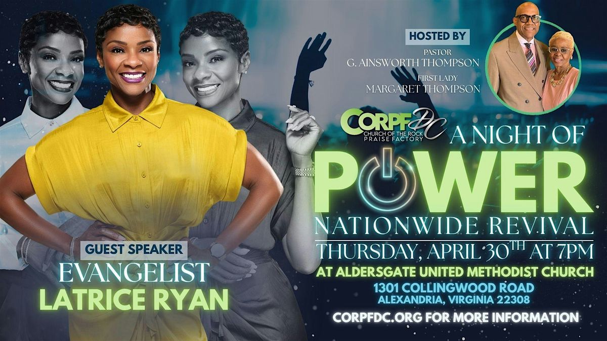 Pastor Grant Thompson and First Lady Margaret Thomspn of Church of the Rock Praise Factory (CORPF-DC) invites you to join us at Aldersgate United Methodist Church for an unforgettable evening full of worship, word and faith! Our city, region, and nation needs God. Evangelist Latrice Ryans will share a dynamic word that will solidify our resolve to seek God's face, together, for the saving of our communities and our nation.