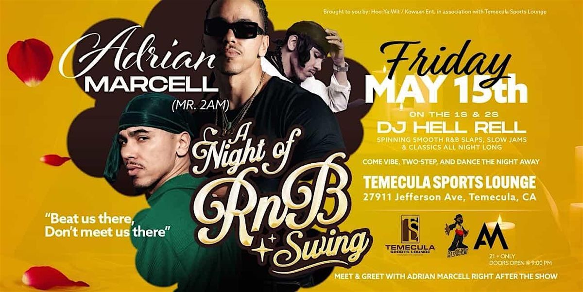 Hop-Ya-Wit / KowaxnEntin association with Temecula Sports LoungePRESENTSA Night of RNB SwingFriday May 15thTemecula Sports Lounge – 27911 Jefferson Ave, Temecula, CAParty starts @ 10:00 PMDJ He’ll Rell spinning:- The best of R&B- All the slaps- Vibes for the grown & sexyLive performance by:Adrian Marcel – performing hit after hit!If you love real R&B,come out and party with DJ He’ll Rell & Adrian Marcel.VIP • Booths • Bottle ServiceCall 510-470-8639