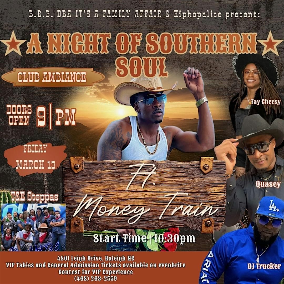 A Night Of Southern Soul with King of Southern Soul DJ Trucker out FL, The Line Dance Queen Taycheesy with Quasey out of Atlanta, and Come Ride the Train with none of than $Money Train himself March 13,