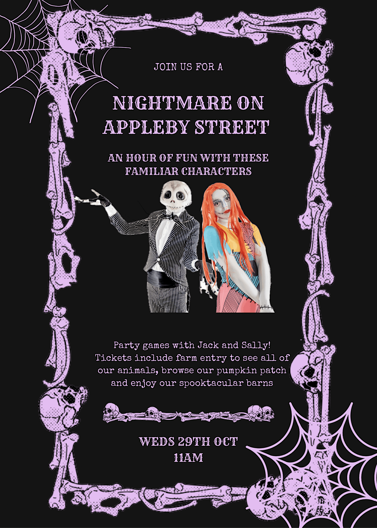 Character party with Sally and Jack! Lots of fun and games for all ages to enjoy! Tickets include farm entry for the participant and entry to our pumpkin patch and spooktacular barns - additional guests/adults will need to pay £5 farm entry on the day!